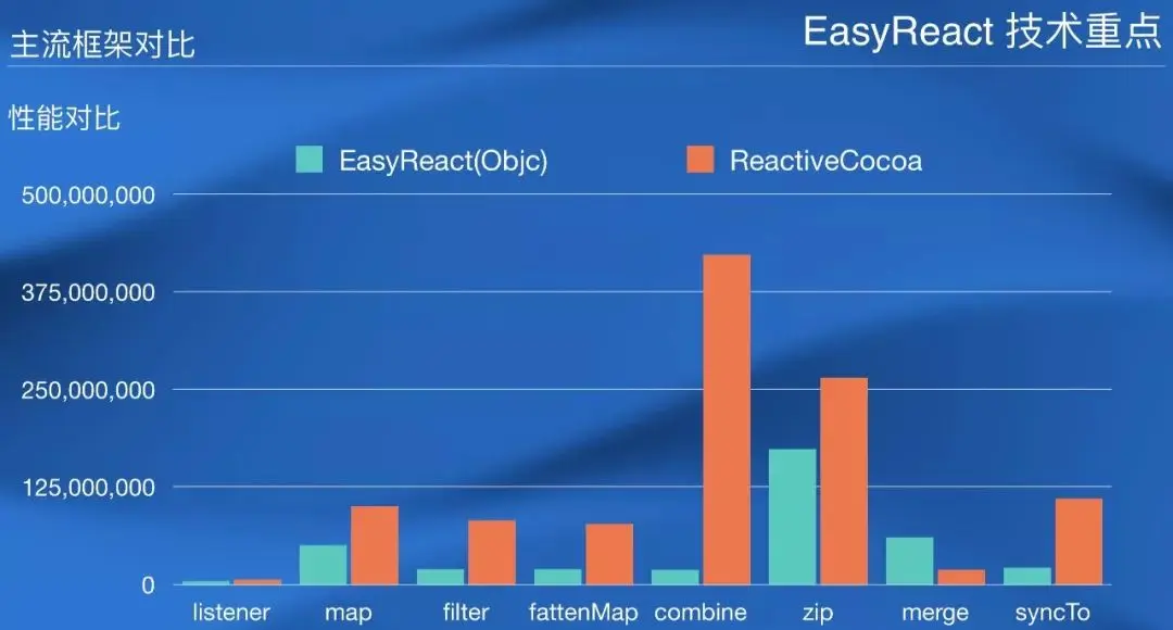 来自美团的臧成威老师分享了他们即将开源的面向对象的响应式架构:EasyReact 以及 EasyMVVM,相信用过 ReactiveCocoa 的同学都很清楚,每次调试时,调用栈非常深,而且中间的调用栈内容几乎没啥用处,调试起来比较费劲,作者表示 EasyReact 相对于 ReactiveCocoa,同样的5次变换操作,前者调用栈只有10层,而 ReactiveCocoa 有50层。关于其它的对比,可以参考一下作者放出的 benchmark 对比图