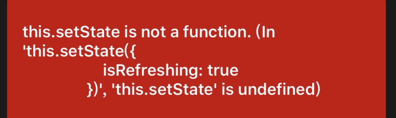 }在RN中,ScrollView内部的其他响应者尚无法阻止ScrollView本身成为响应者,意思也就是,ScrollView内部的组件无法接收响应。故运行过程中,因为onRefresh刷新相应中需要用到回调函数,而在回调函数中使用了this属性,故onRefresh中调用函数需要bind(this),不然会出现报错,错误信息如下: