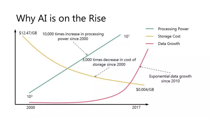 机器学习之所以能够从象牙塔解放出来,得益于三个因素:存储数据变得便宜;可访问数据的数量呈指数级增长;计算机处理能力增加。