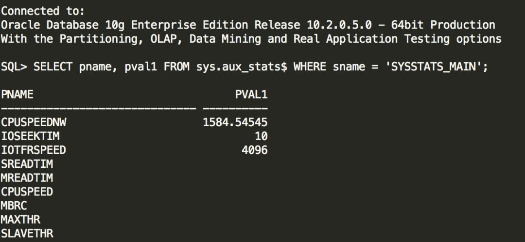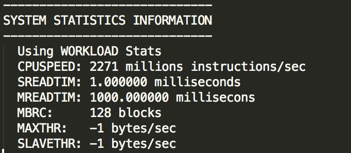 SELECT pname, pval1 FROM sys.aux_stats$ WHERE sname = 'SYSSTATS_MAIN';
