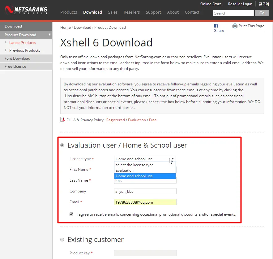 默认选择的Existing customer,我们选择第一项Evaluation user / Home & School user。