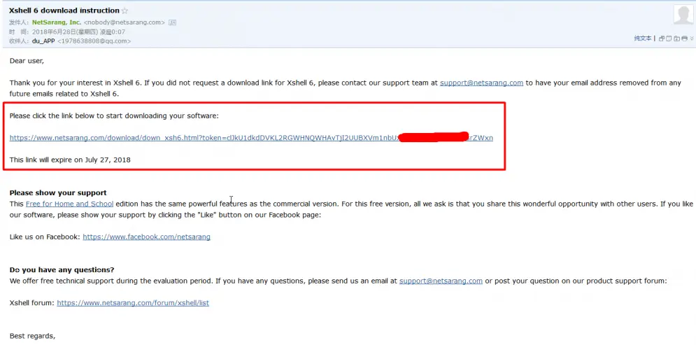 登录邮箱,会发现一个主题为《Xshell 6 download instruction》的邮件,大意就是告诉你欢迎使用xshell,点击下面的链接进行下载。