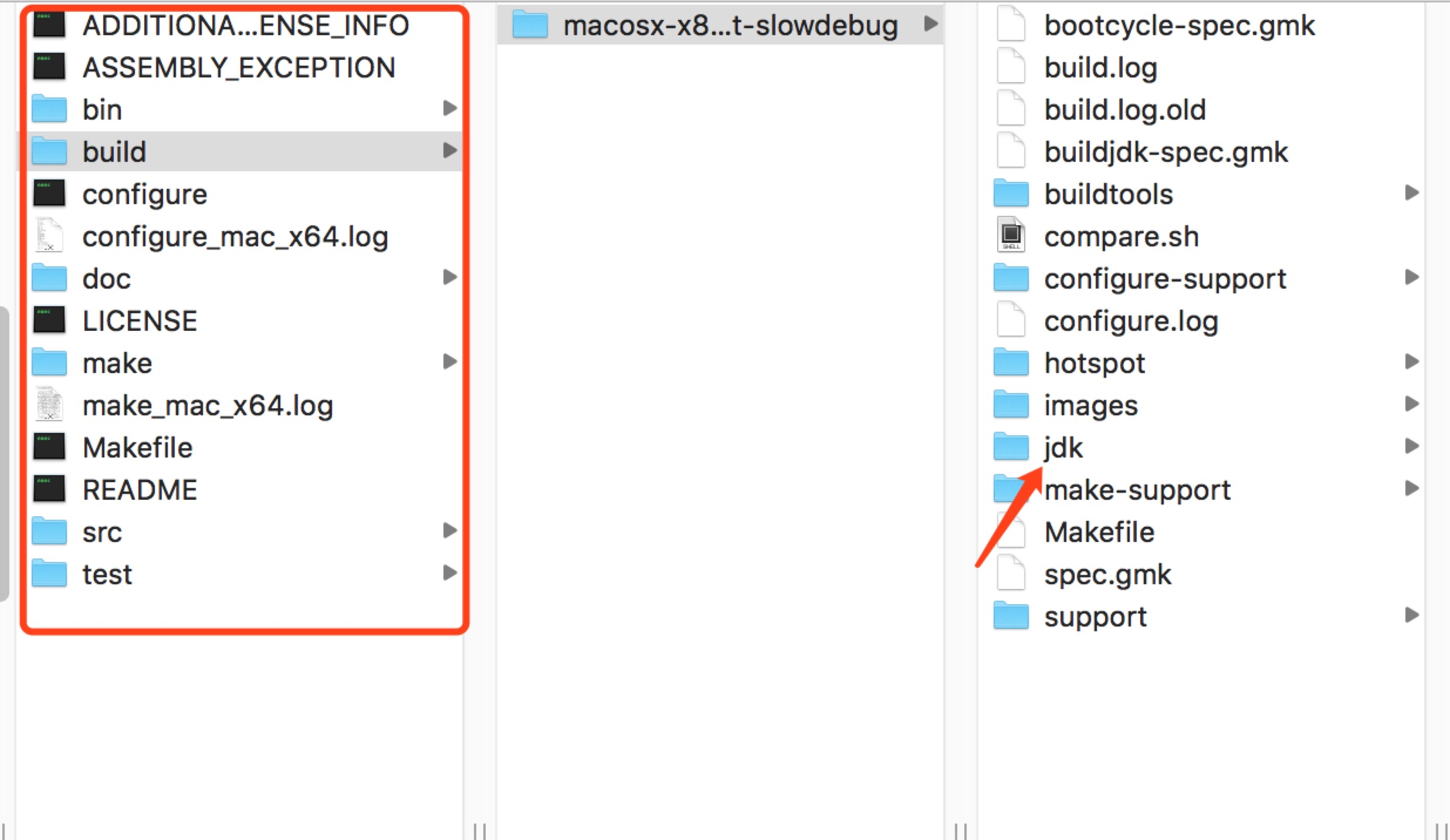 红框就是源码的jdk目录结构。我们进入到图中红色标记的jdk文件夹的bin目录下,执行./java -version。注意不要执行java -version,这样运行的是本机JAVA_HOME里那个java,不是编译的。
