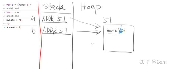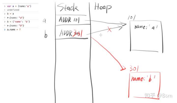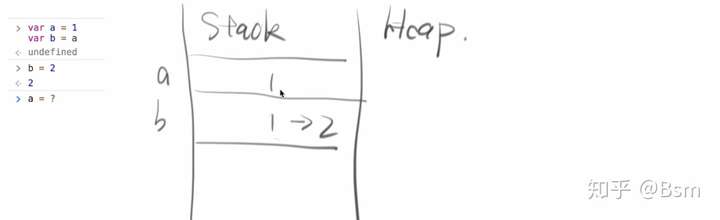 发生在代码里的赋值语句(如b = a),在内存中对应操作为:将a的栈内存区的内容,覆盖抄写到b的栈内存上。而堆内存区,不作改动。