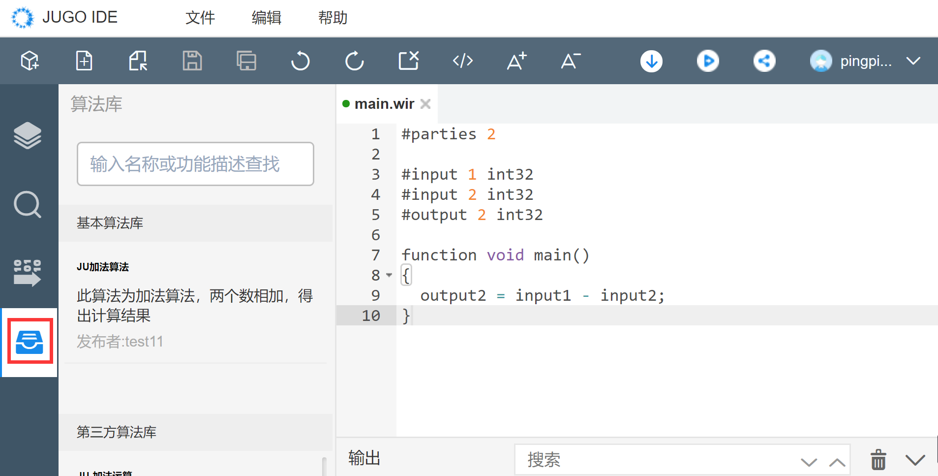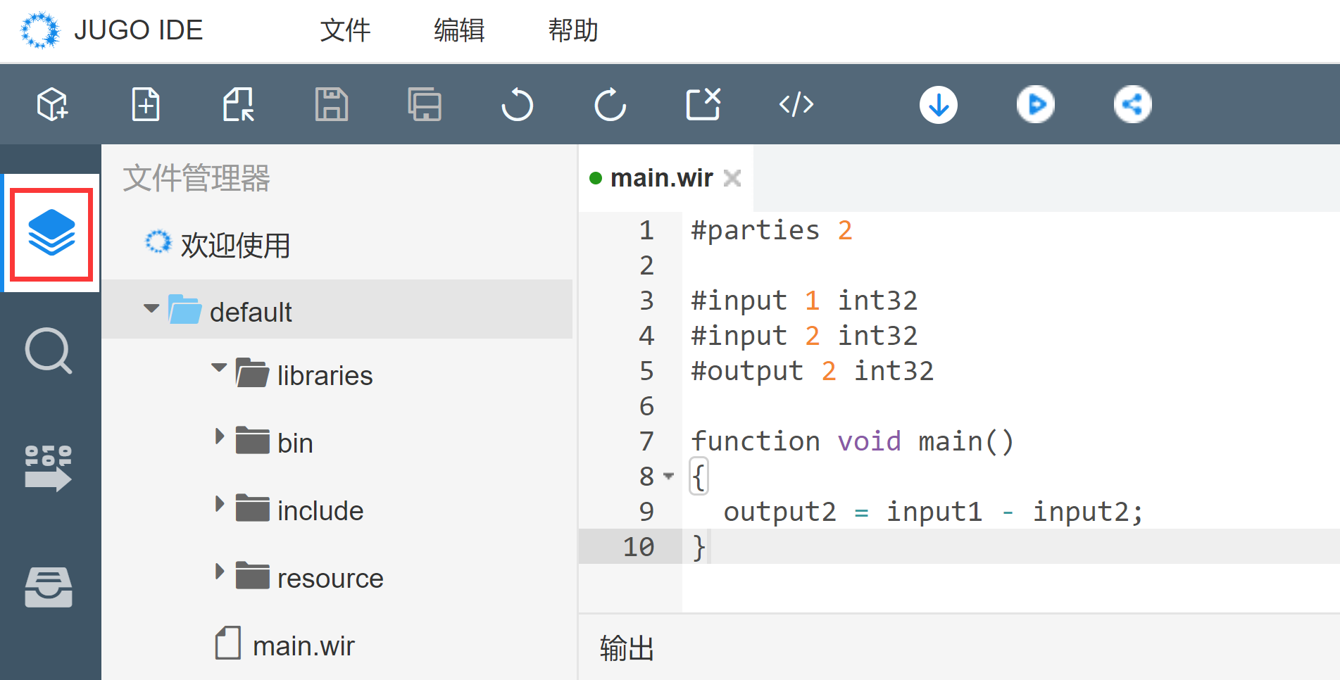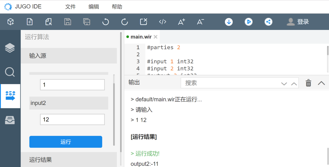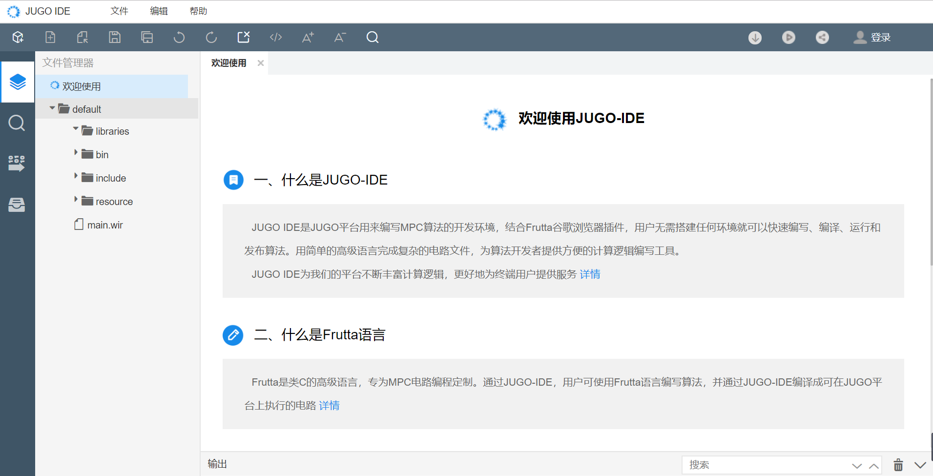 JUGO-IDE是JUGO技术产品面向开发者提供的用来编写MPC算法的开发工具,结合Frutta谷歌浏览器插件,开发者无需搭建任何环境就可以快速编写、编译、运行和发布算法。
