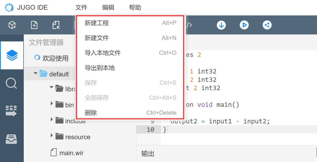 功能描述:提供“新建工程、新建文件、导入本地文件、导出到本地、保存当前文件、保存所有文件、删除当前文件”等功能。