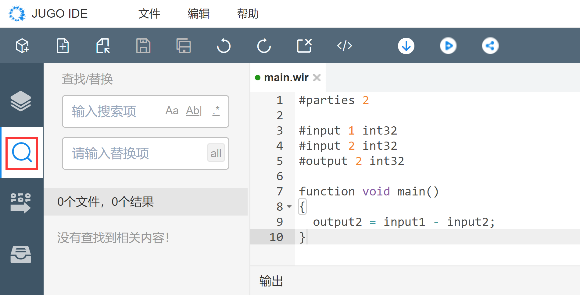 功能描述:JUGO-IDE编辑区提供“查找、替换、代码格式化、字体放大、字体缩小、撤销、恢复”等常用功能。