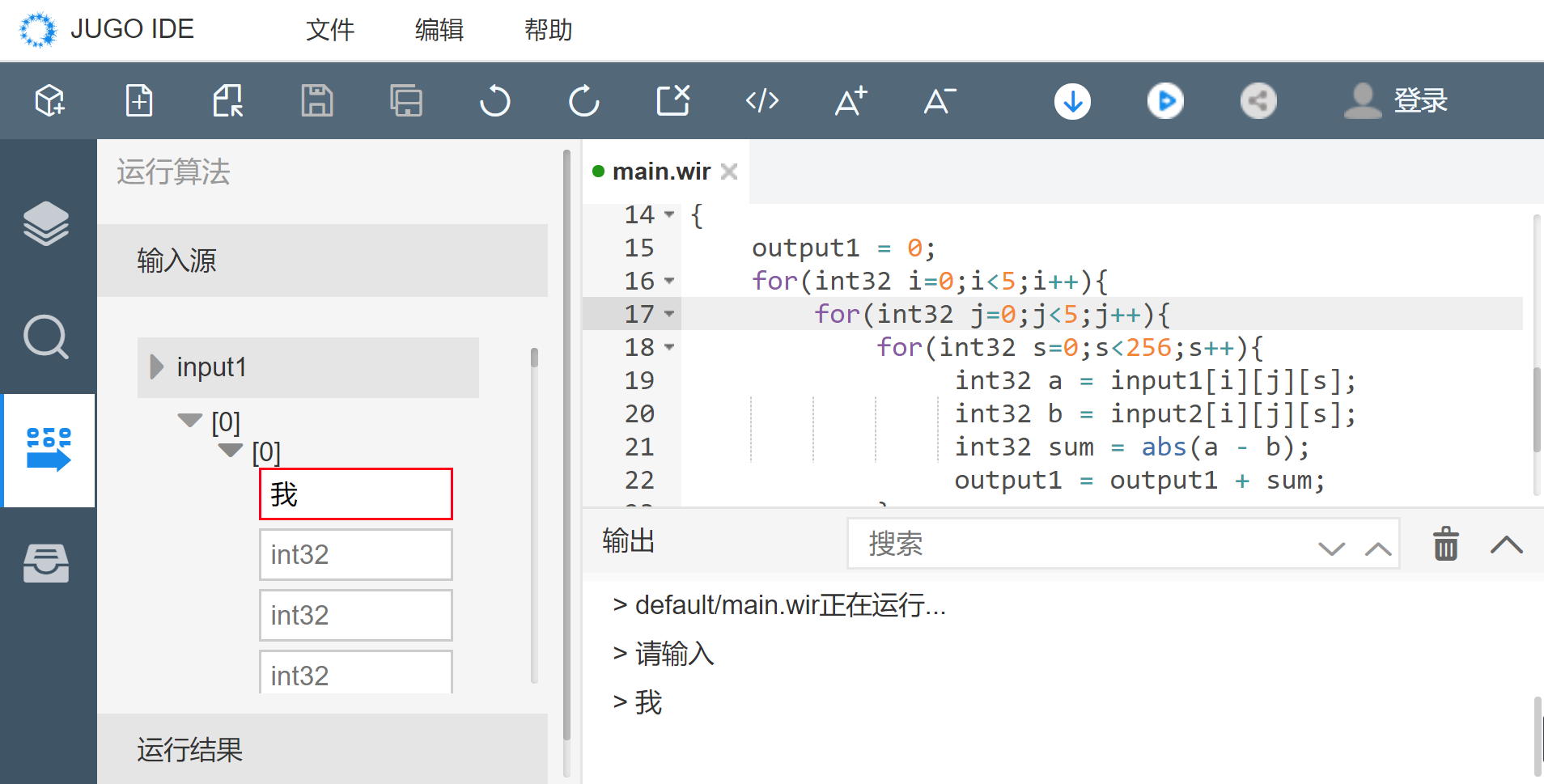 注意:当前算法工程的编译入口文件为“main.wir”。如果选中其它文件点击编译,JUGO-IDE会自动定位到当前选中文件所属的算法工程,并编译该算法工程中的“main.wir”。如果需要编译其它文件,需要在“main.wir”中引入该文件后再点击“编译”。