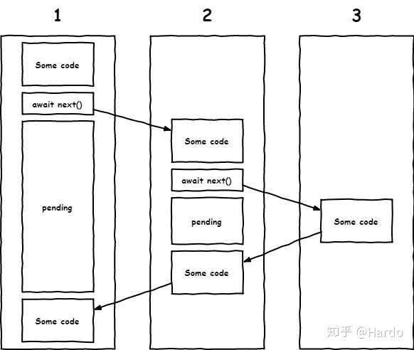 await next()时,挂起中间件1,开始执行中间件2 - 当执行到中间件2中的
