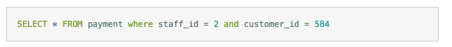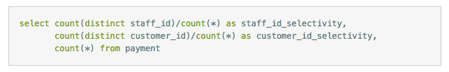 是应该创建(staff_id,customer_id) 的索引还是应该颠倒一下顺序?执行下面的查询,哪个字段的选择性更接近1就把哪个字段索引前面就好。