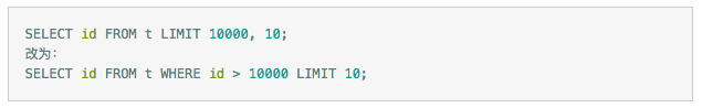 一个常见的问题是当偏移量非常大的时候,比如:LIMIT 10000 20 这样的查询,MySQL需要查询10020条记录然后只返回20条记录,前面的10000条都将被抛弃,这样的代价非常高。
