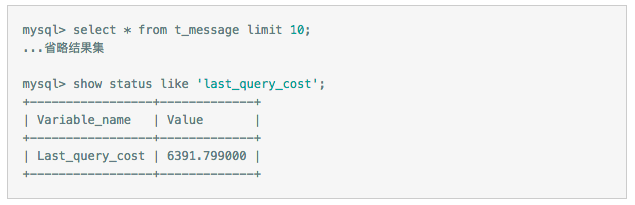 MySQL使用基于成本的优化器,它尝试预测一个查询使用某种执行计划时的成本,并选择其中成本最小的一个。在MySQL可以通过查询当前会话的last_query_cost的值来得到其计算当前查询的成本。