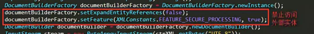 documentBuilderFactory.setExpandEntityReferences(false);documentBuilderFactory.setFeature(XMLConstants.FEATURE_SECURE_PROCESSING, true);