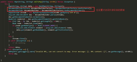 SDK中导致漏洞的代码是WXPayUtil工具类中的xmlToMap()方法:
