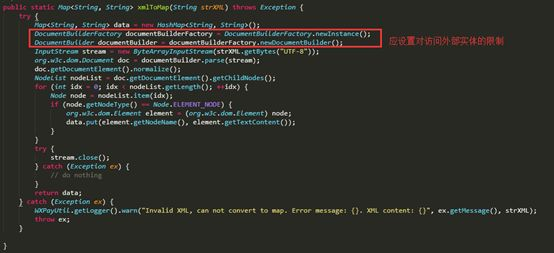 接口中解析xml参数时,没有禁用对外部实体的访问,建议大家最好检查一下自己的应用中是否有类似的漏洞,及时修复。