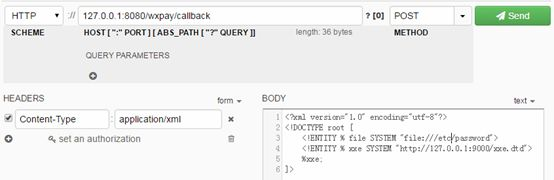 假设本地的web服务器127.0.0.1:8080中存在POST接口:/wxpay/callback,该接口中接收xml字符串做参数,并调用前述的WXPayUtil.xmlToMap(strXml)对xml参数进行解析。此外,/etc/password中存储了重要的密码数据(如password1234)。