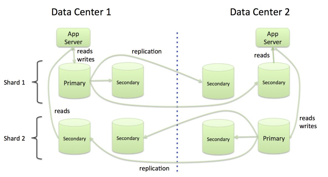 通过这种方式,每个数据中心都有来自所有分片的副本,因此本地应用服务器可以读取整个数据集和一个分片的主分片,以便在其本地进行写入操作。