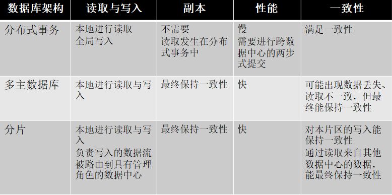 图 5 提供了每一种数据库架构在满足双活应用需求时所存在的优缺点。在选择多主数据库和分区数据库时,其决定因素在于应用是否可以容忍可能出现的读取不一致和数据的丢失问题。