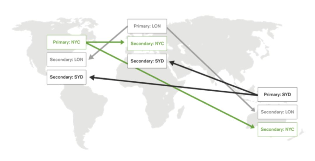 LON 分片在伦敦有一个主分片,在纽约和悉尼有副本。