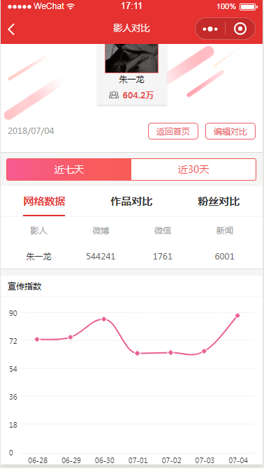 展示一些信息以及用echarts实现的数据图。小程序开始写的时候,echarts并未支持小程序,于是我们在GitHub找到一个别人写的一个可以替代echarts效果的轮子进行使用,不过后期支持后又改为echarts,但是一些效果还未完善,所以不如PC端尽如人意,不过还是棒棒哒。详情页面分享的话,是通过路由传递参数实现数据分享的,通过路由获取的id再请求一次数据