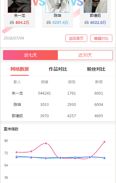 通过筛选进行选择需要对比的人物。可以进行增删改查的操作(主要通过控制任务的Id进行修改,存到storage到另外页面进行获取)。可进行下拉刷新。智能匹配是负责数据分析的同事写的代码执行的,不过效果不甚理想。