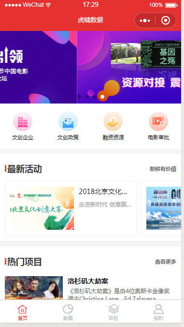 虎啸数据小程序初衷是一款依据虎啸数据-文化创意平台进行数据展示的小程序。主要内容是一些榜单、详情、数据echarts展示及对比。后期平台方向变化,有添加一些活动及项目详情及报名部分(导致内容较为复杂)。并未涉及太过于复杂的api,逻辑处理较为中等,在此回忆一番,就当总结一下经验。