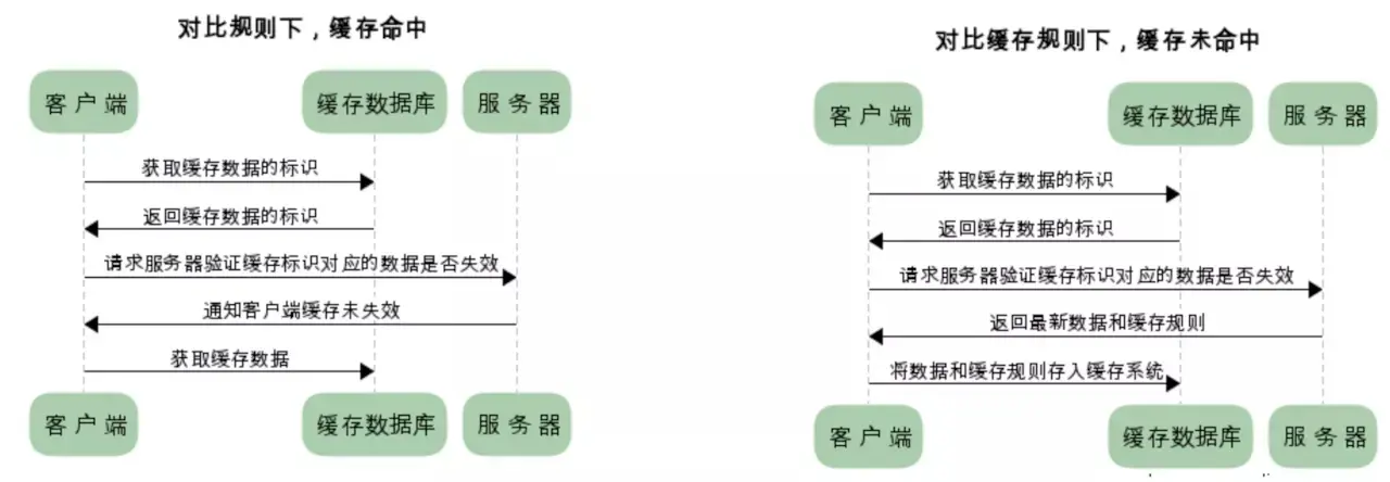 又称对比缓存,客户端会先从缓存数据库中获取到一个缓存数据的标识,得到标识后请求服务端验证是否失效,如果没有失效服务端会返回304,此时客户端直接从缓存中获取所请求的数据,如果标识失效,服务端会返回更新后的数据。