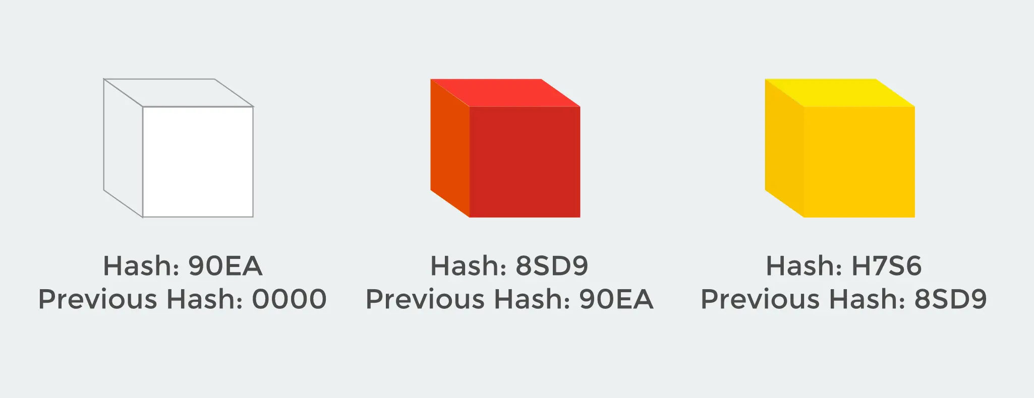 如你所见,每个区块由资料(未显示)、杂凑值、和前一个区块杂凑值所组成。举个例子,黄色区块包含了自己的杂凑值H7S6、和红色区块的杂凑值8SD9。以这种方式,它们组成了一个链结,并以此连结在一起。现在,假设有个骇客入侵并尝试更动红色区块。请记住,每次一个区块以任何方式被更动时,区块的杂值凑也会被更动!因此,当下一个区块执行确认、并看到前一个区块的杂凑值并不吻合时,它会有效地将自己从「链」中分离出来,而不会被骇客读取。