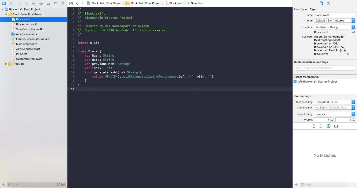 你会注意到,侧边栏里有两个重要的类别:Block及Blockchain。打开这些档案,你会看到档案是空的,那是因为我将会引导你写出这些类别的逻辑。那我们开始吧!