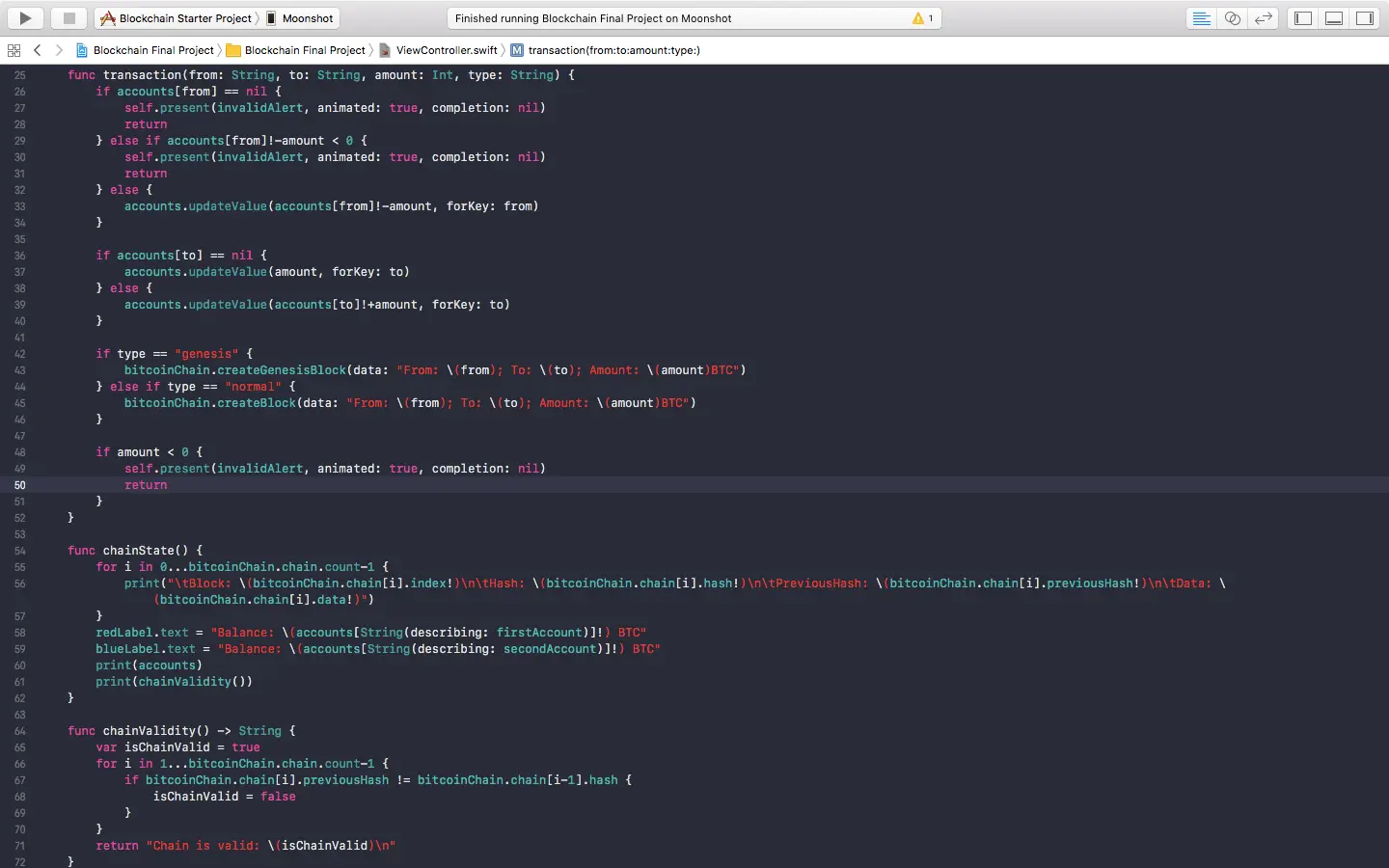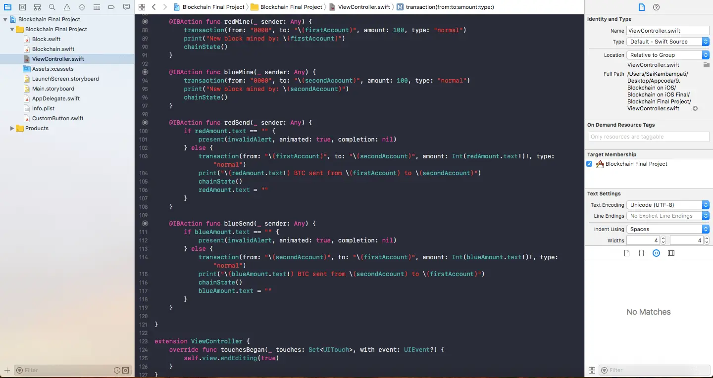 跟之前有点相似,我们在bitcoinChain中重复验证每个区块,来确认前一个区块的杂凑值是否与目前区块所描述的内容符合。 这样就完成了!我们已经定义了函式,并将会每次都用到它们!你的ViewController.swift现在应该看起来像这样: