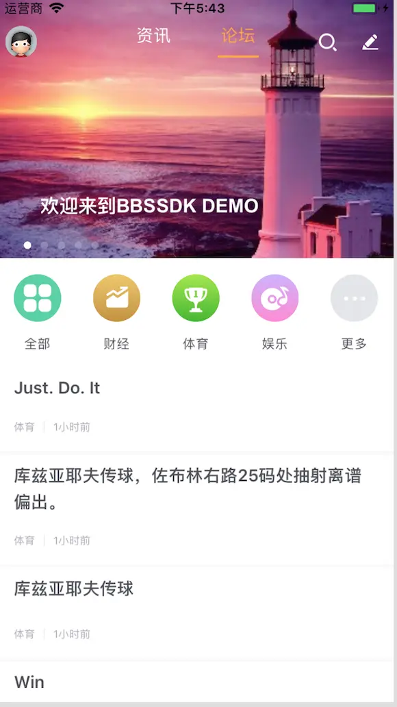 • 通过集成我们的SDK,你可以自己设定整个界面显示的内容,比如首页部分,该界面有资讯和论坛两个部分,如果用户有不同的业务需求,则用户可以通过后台的配置,可以隐藏或者显示指定的内容,能更好的适用于不同的业务场景。