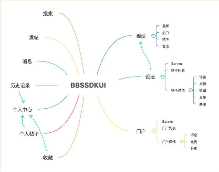 主界面展示了论坛和门户两大模块.这两个模块实现不同业务功能,但并不一定全部展示.展示哪个模块由后台决定,用户可以通过后台进行手动配置.功能结构如下: