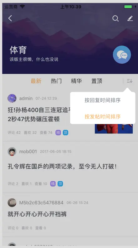 • 由于BBSSDK中包含有多个板块内容,且每个板块内容是完全不同分类的,该用户也可以只使用板块中的一种来展示自己内容,并在改部分也有分类筛选以及按回复时间排序和按发帖时间排序等功能。
