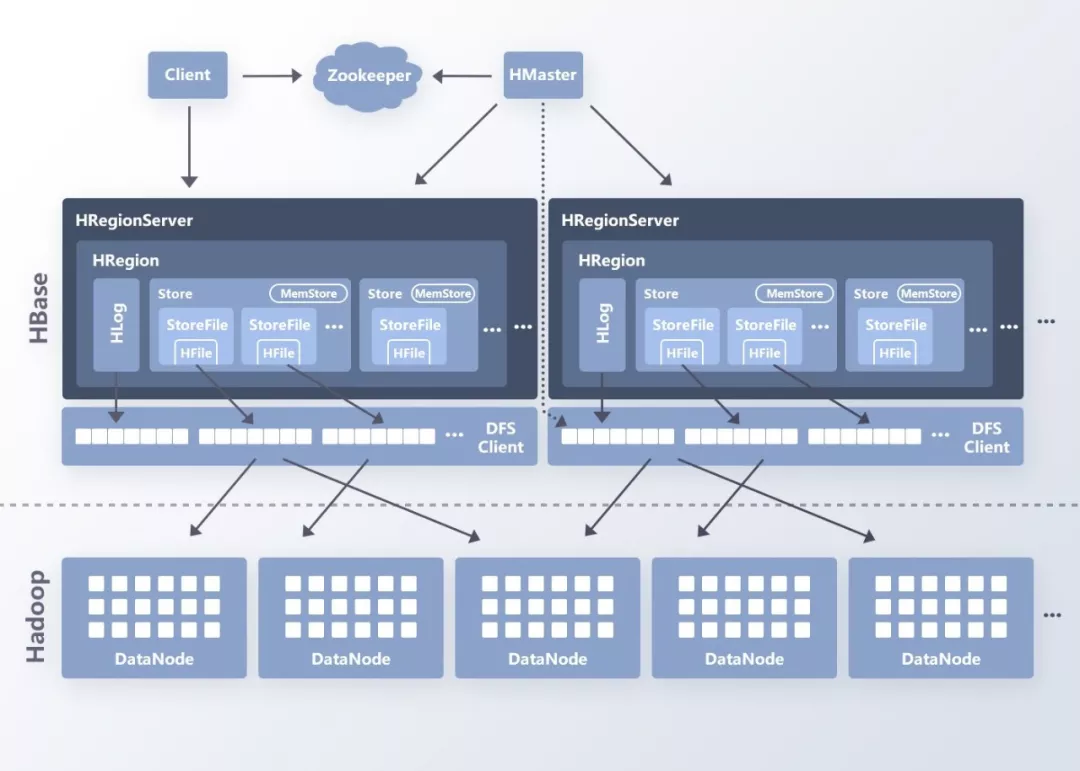 参考Google的Bigtable(详情见Big table: A Distributed Storage System for Structured Data)及Hadoop生态的HBase(图5),作为一种分布式的、可伸缩的大数据存储系统,Bigtable与HBase能很好的支持数据随机与实时读写访问,更适合FunData数据系统的数据量级和复杂度。
