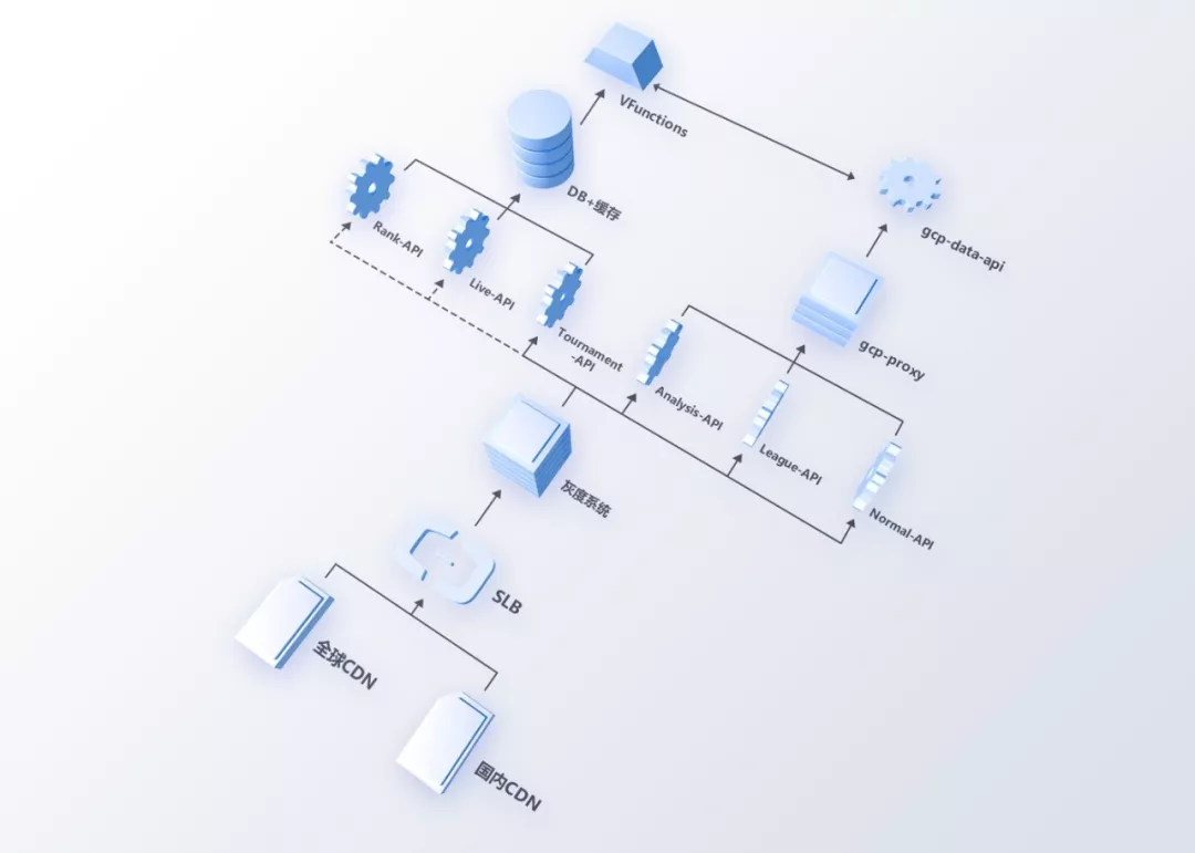 接入分布式存储系统后,对外数据API层也根据扩展的数据维度进行拆分,由多个数据API对外提供服务,例如比赛数据和联赛赛程等数据访问量大,应该与英雄、个人及道具数据分开,防止比赛/赛事接口异常影响所有数据不可访问。