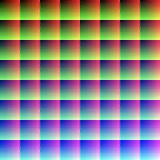 因此,我们需要另辟蹊径,从上面的分析上看,如果我们制作一张包含所有颜色的图像,对这幅图像进行一次期望的调色过程,那么这幅图像上所有颜色都会经历一次色彩映射。因此我们便可以参考这幅图像的改变轨迹。业界常用的手段即是使用这种方法,实现简化高效版的颜色查找,下图是我们经常使用的颜色查找表的原始图像,大小为512*512。