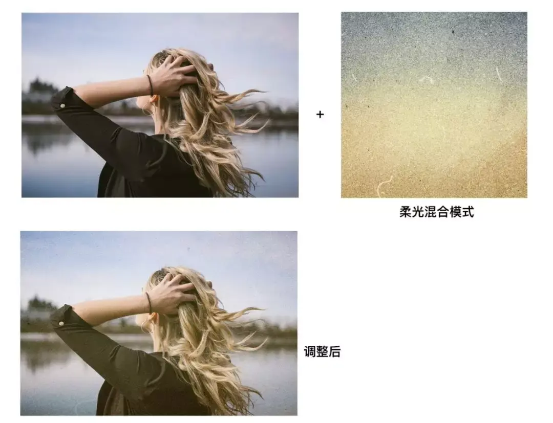 例如,我们想设计一款Vintage风格的滤镜,首先,我们先设计或者寻找一张颗粒材质的图像,使用混合模式中的柔光混合,便可以使照片具有复古风格的胶片感。