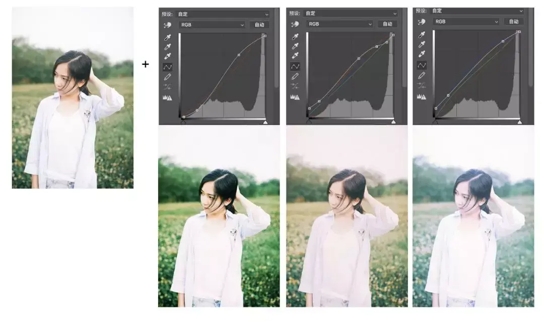 我最常用的调整工具就是曲线、饱和度、色彩平衡、可选颜色,这几个工具配合起来可以很快调出期望的颜色效果。例如下面这个仿Vsco里某个滤镜,用一个 rgb 曲线就可以制作出来。
