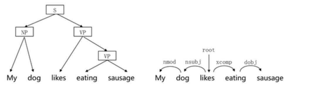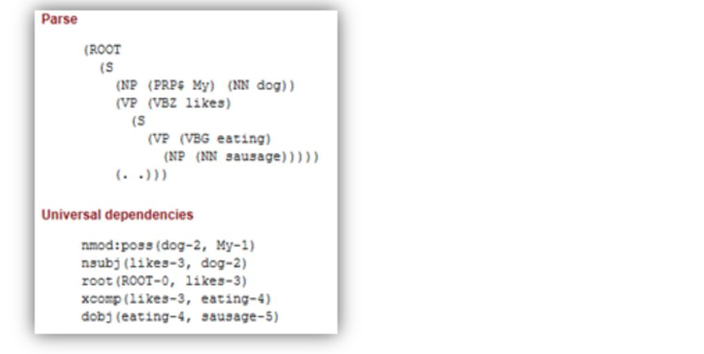 下面举个简单的例子,"My dog likes eating sausage." 使用Stanford parsing tool进行句法分析可以得到如下结果: