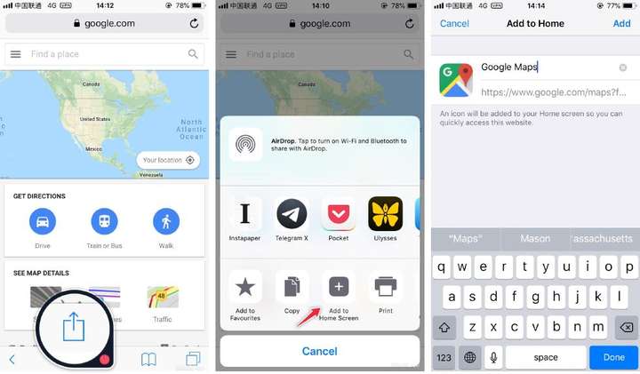 - 手动点击分享图标,再点击添加到主屏幕,最后点击确定即可