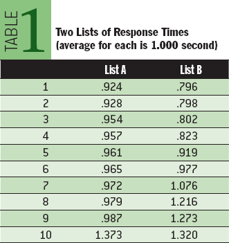 例 3 假想每天运行在你的计算机上的任务的响应时间的容忍极限是 1 秒。进一步假设「表1」列出了该任务执行 10 次的测量值。 这两个列表的平均响应时间都是 1 秒。哪一个你认为更好?