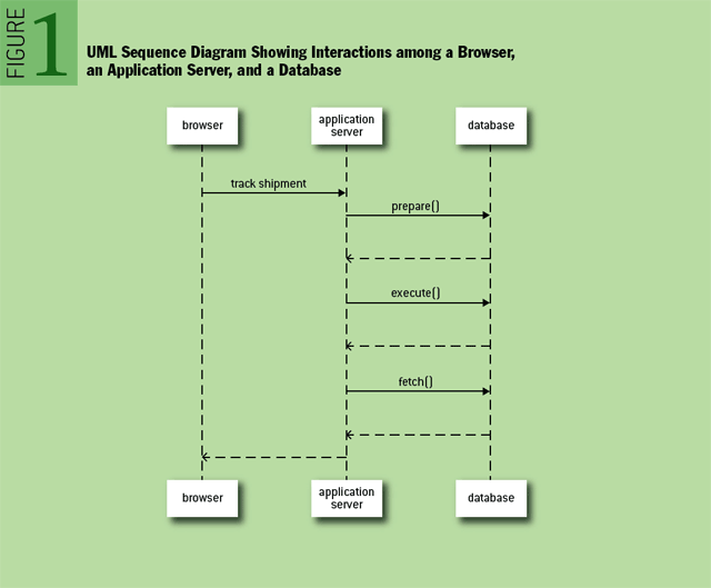 序列图是一种 UML(统一建模语言)中定义的图形种类,用于表达对象间交互的发生顺序。序列图特别适合用于可视化的表达响应时间。 在「图1」中,我们展示了一个由浏览器、应用服务器和数据库构成的简单应用系统的序列图。
