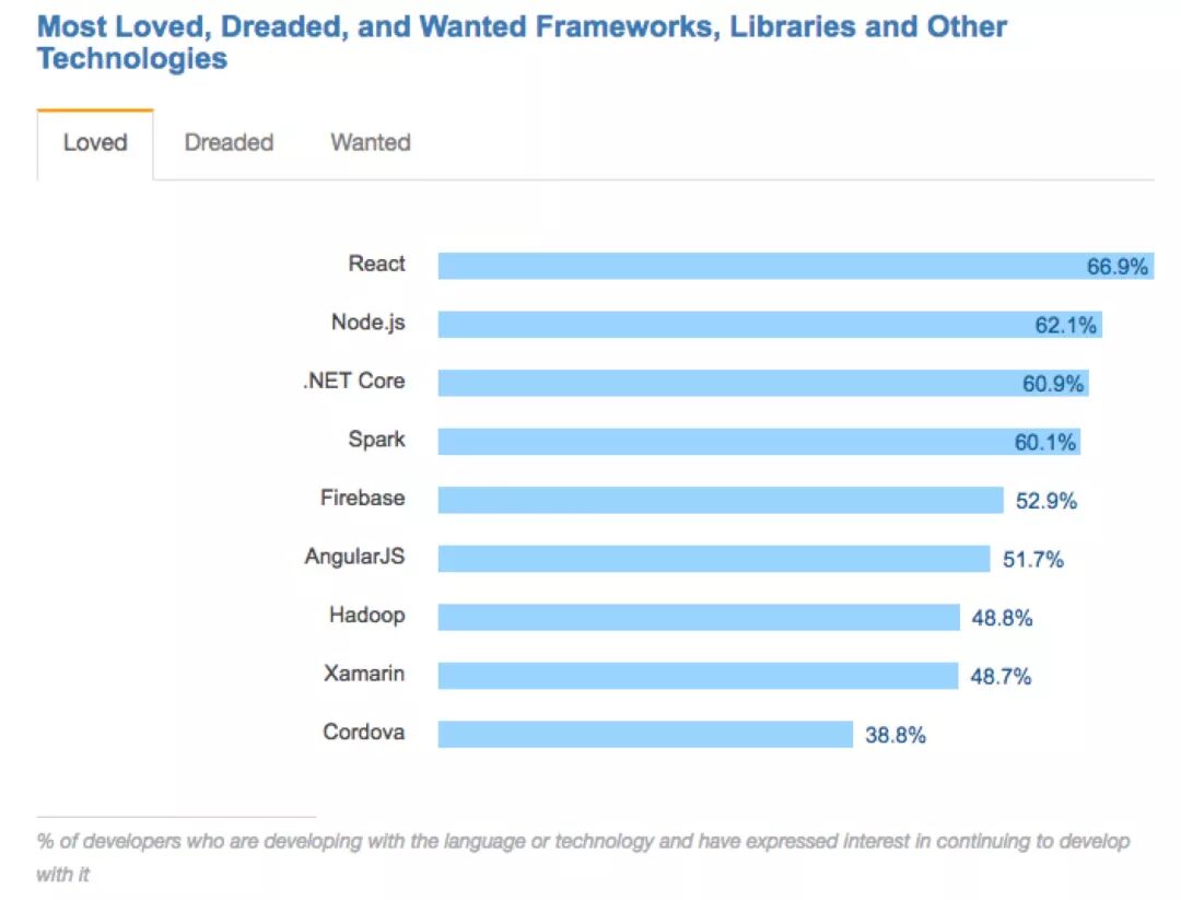 虽然从数字来看,React 的使用率仍不及 Angular,但它在 Stack overflow 的 2017 年度用户最喜爱组件库评选中拿下了榜首位置: