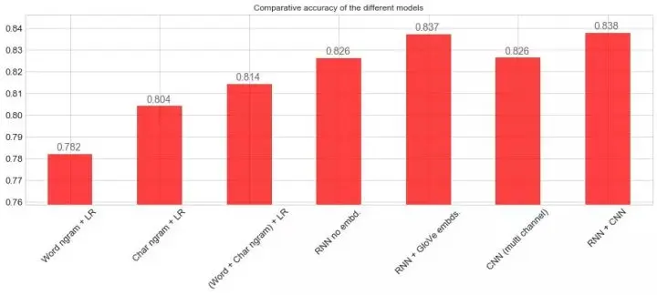'RNN no embd.', 'RNN + GloVe embds.', 'CNN (multi channel)',