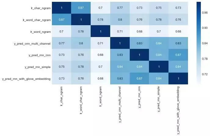 sns.heatmap(predictions.drop('y_true', axis=1).corr(method='kendall'), cmap="Blues", annot=True);