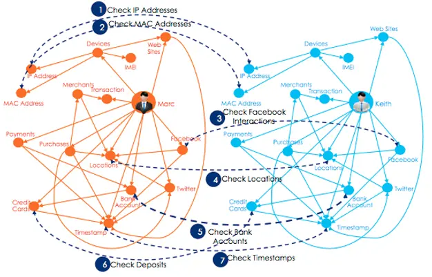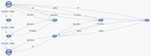 通过图分析可以清楚地知道洗钱网络及相关嫌疑,例如对用户所使用的帐号、发生交易时的IP地址、MAC地址、手机IMEI号等进行关联分析。