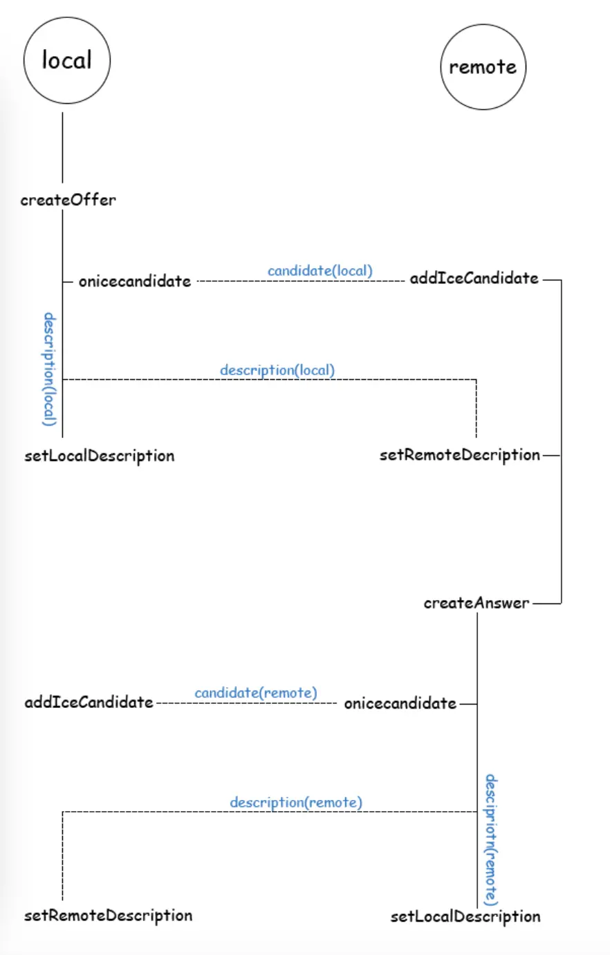什么是描述信息呢?大概就是一个设备的信息,当一个peer打算把自己的设备stream发送给另外一个peer使用的时候,需要将设备信息告诉给对方,比如视频的编码之类的。怎么交换呢?peer需要通过一个offer和answer操作来实现。