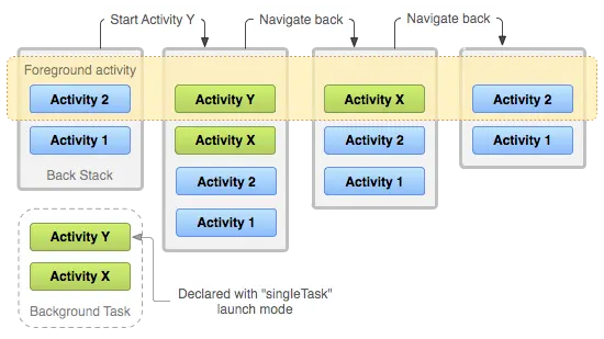 无论 Activity 是在新任务中启动,还是在与启动 Activity 相同的任务中启动,用户按“返回”按钮始终会转到前一个 Activity。 但是,如果启动指定 singleTask 启动模式的 Activity,则当某后台任务中存在该 Activity 的实例时,整个任务都会转移到前台。此时,返回栈包括上移到堆栈顶部的任务中的所有 Activity。