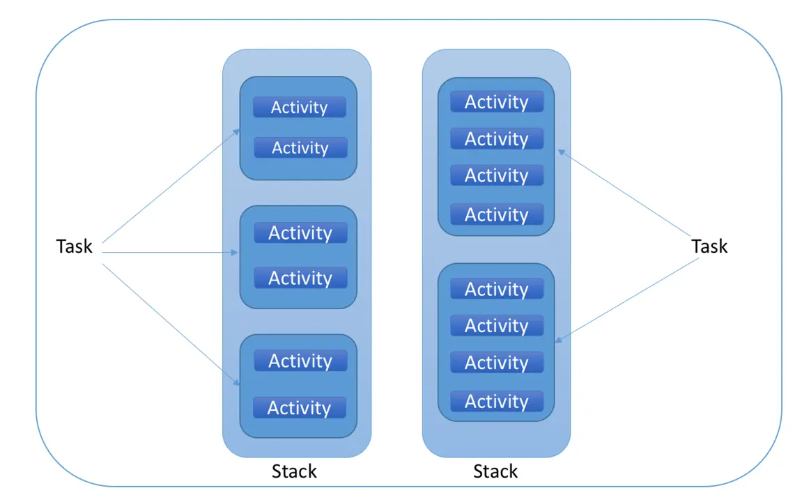Task是指在执行特定作业时与用户交互的一系列 Activity。 这些 Activity 按照各自的打开顺序排列在Stack(即返回栈)中。即使这些 Activity 可能来自不同的应用,但是 Android 仍会将 Activity 保留在相同的Task中,以维护这种无缝的用户体验。