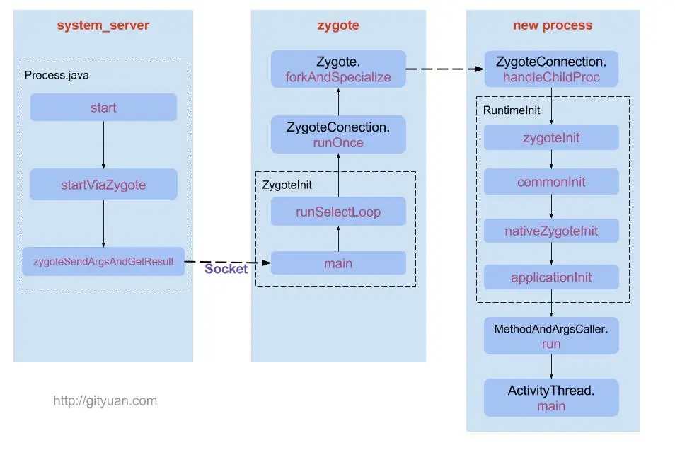 Zygote进程fork出新的子进程,即App进程;